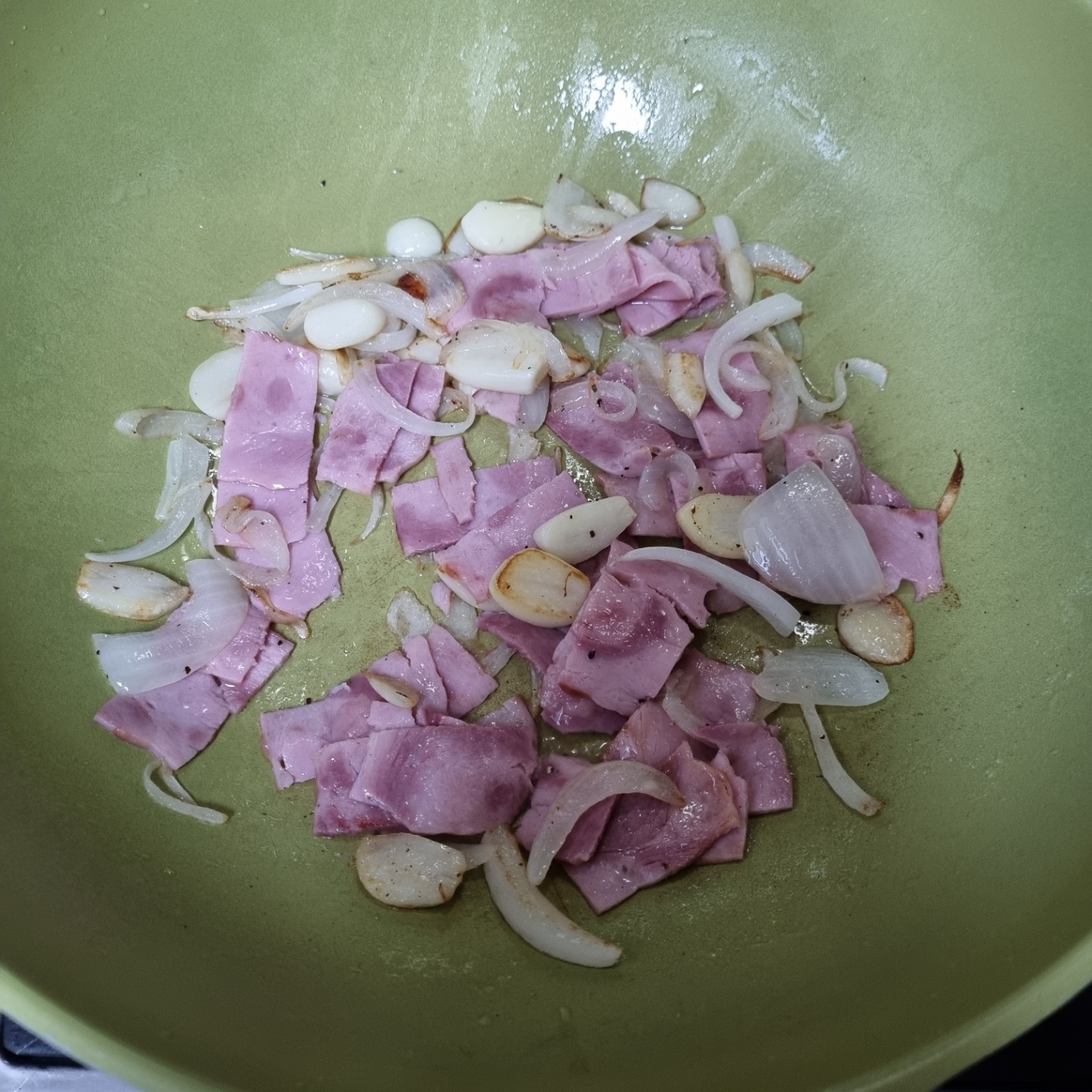 7. 베이컨을 넣고 볶는다.