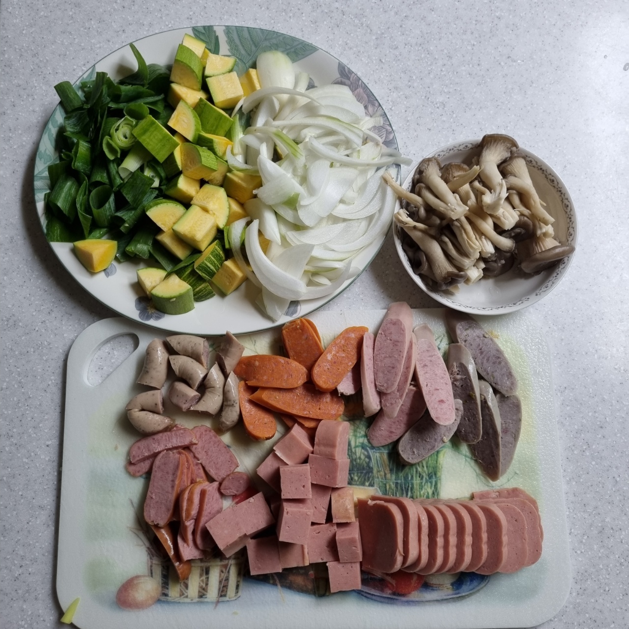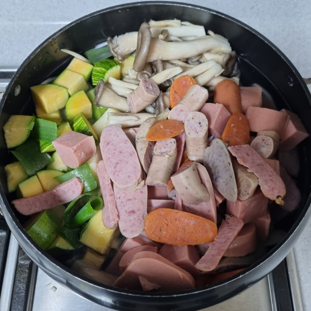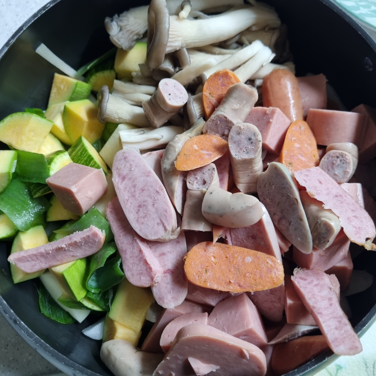 4. 호박, 버섯, 햄, 소세지를 넣는다.